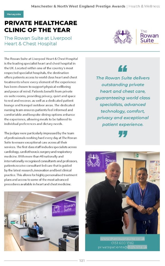 Rowan Suite at Liverpool Heart and Chest Hospital has been recognised in the Manchester and North West Prestige Awards 2025/26.